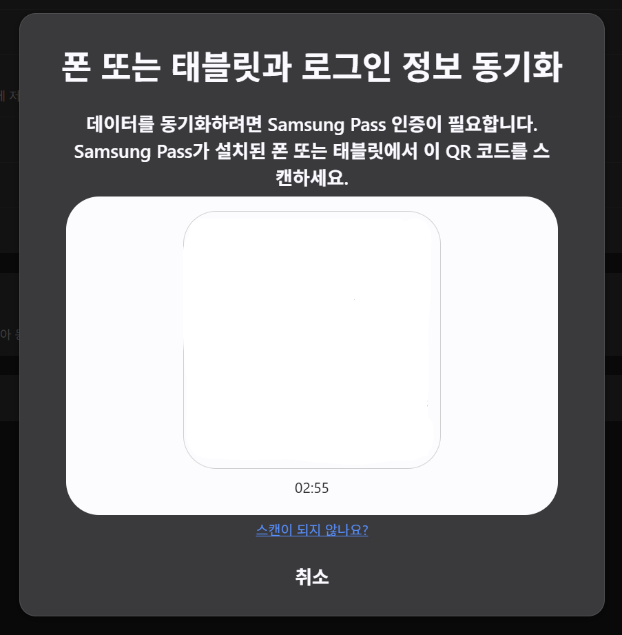 설정에서는 로그인 정보를 Samsung Pass와 동기화할 수 있는데요, 이 코드를 휴대폰으로 스캔한 후 설정을 완료하면 동기화가 자동으로 켜지는 모습을 볼 수 있습니다.
