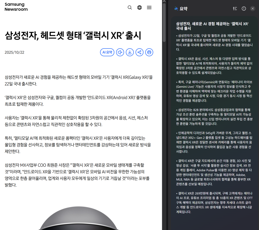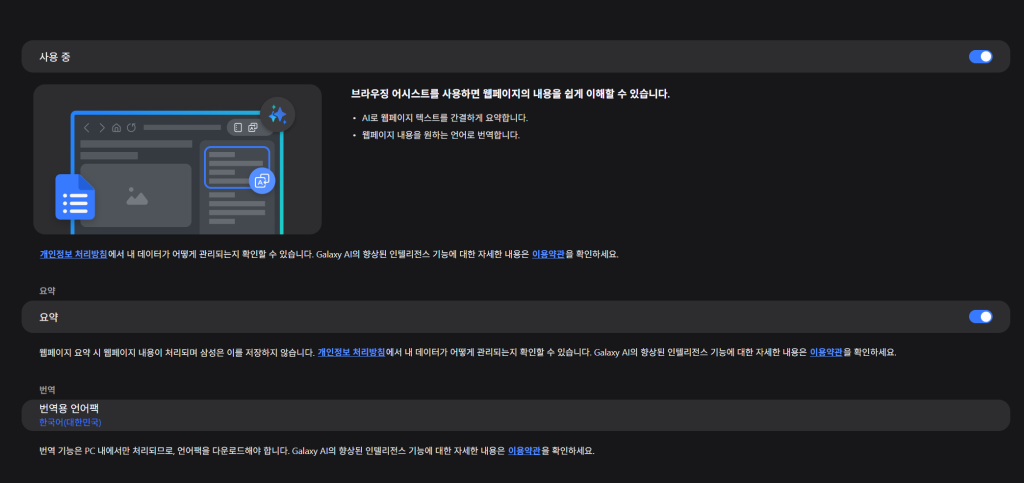 최근 삼성 앱과 Galaxy AI와의 연동성이 강화된 만큼 PC 삼성 인터넷에도 Galaxy AI의 브라우징 어시스트 기능이 들어간 것을 확인할 수 있습니다. 모바일과 동일하게 요약과 번역을 사용할 수 있습니다.