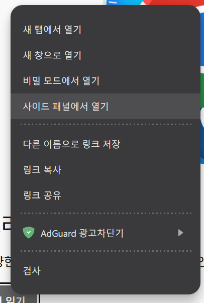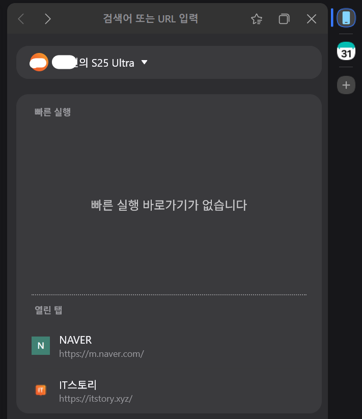 이렇게 빠른 실행 바로가기와 휴대폰에 열려있는 탭을 바로 볼 수 있는데요, 누르면 사이드바에서 탭을 바로 볼 수 있습니다. 특이하게도 주소창에 주소를 입력해서 모바일 브라우저를 바로 사용할 수 있는데요, 웨일의 모바일창이 연상되는 기능입니다. 사이드바에서 탐색하고 있지 않더라도, 일반 링크의 오른쪽 클릭에서도 ‘사이드바의 열기’ 옵션으로 이 창에서 바로 볼 수 있죠. 이렇게 보면, 단순한 모바일 연동만을 위한 기능은 아닌 셈이죠.