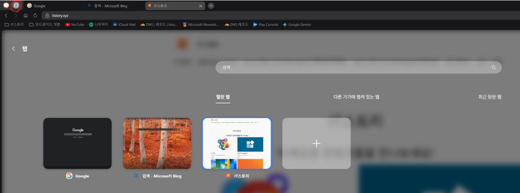 계정 아이콘 바로 옆에 있는 탭 아이콘으로 탭을 한눈에 관리할 수 있는 기능도 탑재했습니다.