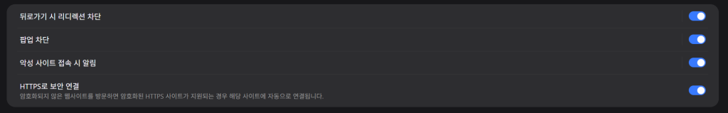 삼성 인터넷의 개인정보 보호 기능도 모두 탑재한 것을 알 수 있습니다.