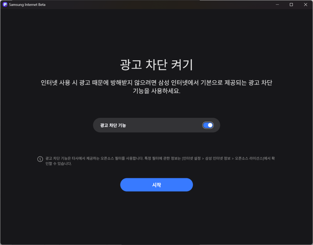 다음 화면에서 삼성 인터넷의 특장점이 드러나는데요, 바로 휴대폰의 삼성 인터넷과 완벽화 동기화 기능을 갖추었습니다. 또한 삼성 인터넷의 장점으로 꼽히는 광고 차단 가능도 기본으로 탐재되어 있습니다. 이 광고 차단 기능은 Adblock의 EasyList 등을 사용하는 것으로 보입니다.